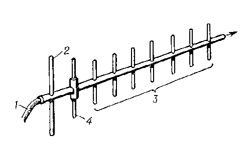 Рис. 11. Антенна типа «волновой канал»:1 — кабель питания; 2 — рефлектор; 3 — директоры; 4 — активный вибратор. Направление максимального излучения показано стрелкой.