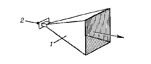 Рис. 12. Рупорная антенна: 1 — рупор; 2 — питающий радиоволновод. Направление максимального излучения показано стрелкой.