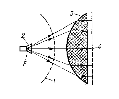 Рис. 13. Линзовая антенна: 1 — фронт волны, падающей на линзу; 2 — облучатель; 3 — линза; 4 — фронт волны, прошедшей, через линзу; F — фокус линзы. Стрелками показан ход лучей.