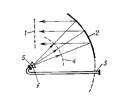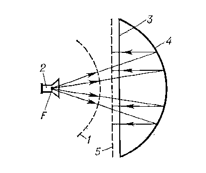 Рис. 14. Параболическая антенна: 1 — фронт волны, падающей на зеркало; 2 — облучатель; 3 — раскрыв зеркала; 4 — параболическое зеркало; 5 — фронт волны, отражённой от зеркала; F — фокус параболоида. Стрелками показан ход лучей.