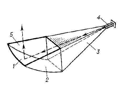 Рис. 16. Рупорно-параболическая антенна: 1 — параболическая поверхность; 2 — щека; 3 — рупор; 4 — питающий радиоволновод; 5 — раскрыв антенны. Направление максимального излучения показано стрелкой.