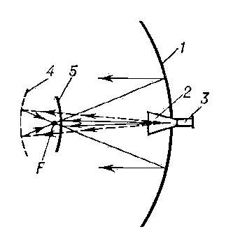 Рис. 17. Двухзеркальная антенна: 1 — основное параболическое зеркало; 2 — облучатель; 3 — питающий радиоволновод; 4 — вспомогательное эллиптическое зеркало; 5 — вспомогательное гиперболическое зеркало; F — фокус антенны. Стрелками показан ход лучей.