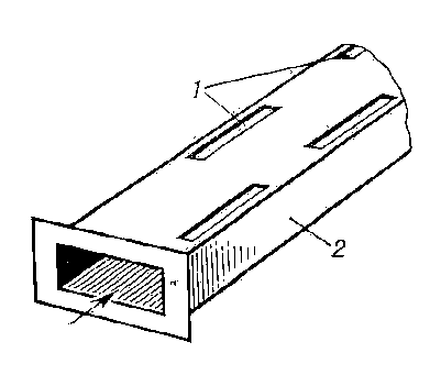 Рис. 18. Волноводная щелевая антенна: 1 — щелевые вибраторы; 2 — радиоволновод. Стрелкой показано направление движения электромагнитной энергии в радиоволноводе.