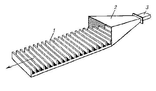Рис. 19. Антенна поверхностной волны (импедансная антенна): 1 — ребристая замедляющая структура; 2 — рупорное возбуждающее устройство; 3 — питающий радиоволновод. Стрелкой показано направление максимального излучения.