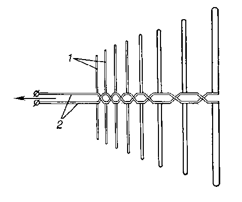 Рис. 20. Логопериодическая вибраторная антенна: 1 — вибраторы; 2 — линия питания. Стрелкой показано направление максимального излучения.