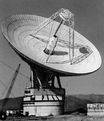Перспективы развития А. В 60-е гг. 20 в. наметился ряд перспективных направлений развития теории и техники А. Наиболее важные из них: 1) создание антенных решёток из большого числа излучающих элементов (электрических вибраторов, рупоров и др.), каждый из которых подведён к отдельному выходному блоку передатчика, имеющему регулируемый фазовращатель. Управляя соотношением фаз полей в отдельных излучающих элементах, можно быстро менять направление максимального излучения, а также форму диаграммы направленности А. Идентичным образом создаются приёмные антенные решётки из большого числа слабонаправленных А., подключаемых к отдельным входным блокам приёмника. 2) Создание А., основанных на методе апертурного синтеза, заключающегося, в частности, в перемещении одной или нескольких небольших по размерам А. с последовательной фиксацией в запоминающем устройстве амплитуды и фазы принятых сигналов. Соответствующим суммированием этих сигналов можно получить такой же эффект, как от большей А. с линейными размерами, равными длинам путей перемещения малых А. 3) Создание экономичных, легко устанавливаемых А. (зеркальных А., антенн-башен и антенн-мачт и др.) на основе использования металлизированных плёнок, с применением пневматики для придания А. необходимой конфигурации. 4) Широкое внедрение строгих методов анализа и синтеза (проектирование по заданным характеристикам) А. на основе применения электронных вычислительных машин. 5) Развитие статистических методов анализа А.