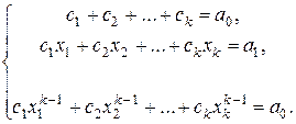 При n =0,1,…, k -1, из равенства (4) мы получим систему линейных уравнений относительно c 1,…, ck: