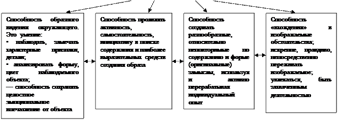 На основе анализа исследований по проблеме целенаправленного и активного воздействия на развитие художественно – творческих способностей, проводимых в 60 – 70 г. г. XX в. и по настоящее время (Н. П. Сакулина, Т. С. Комарова, Т. Г. Казакова, Н. Б. Халезова, В. И. Езикеева и др.). Г. Г. Григорьева уточнила структуру способностей к изобразительной деятельности детей дошкольного возраста.