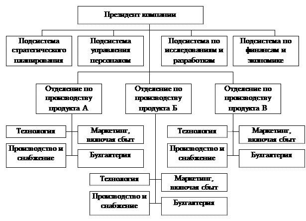 Дивизиональная (отделенческая) структура. Смысл этой схемы в том, что верхний уровень управления сохраняет за собой лишь стратегические решения, связанные, в первую очередь, с распределением материальных ресурсов, а все оперативные решения передаются на нижние уровни, которые получают максимальную самостоятельность. Эта схема применяется, например, для управления зарубежными отделениями фирмы. Контроль за деятельностью отделений при этом ограничивается минимальным числом показателей, например прибылью и ассортиментом продукции.