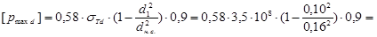 | Максимальный расчетный натяг в соединении, в котором обеспечивается прочность соединяемых деталей, с учетом неравномерности распределения удельного давления по контактным поверхостям, определяется по предельно допустимому давлению: | |||||||||||||||