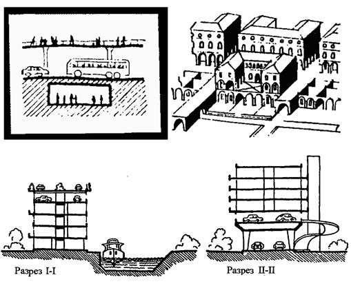 Освоение подземного пространства. Вертикальное разделение транспорта и пешеходов более эффективно, так как позволяет при размещении транспортных коммуникаций и автостоянок под землей увеличить площадь открытых озелененных пространств в уровне земли. В этом случае узловые пункты городского центра должны быть оборудованы лестничными ступенями, пандусами (эскалаторами, лифтами), соединяющими разные уровни городского движения.