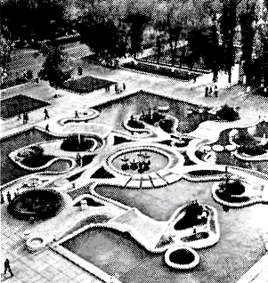 Водное благоустройство. Водная поверхность — столь привлекательный ландшафтный компонент городской среды, что редкий градостроительный проект общественного центра (особенно конкурсные) обходится без разработок, предлагающих акваторию в качестве ядра пространственной композиции. В общественных центрах всех уровней желательно применение искусственных фонтанов, небольших водопадов, каскадов, разбрызгивающих устройств, которые обладают высокой декоративностью и регулирующими среду качествами. Применение водных устройств способствует снижению запыленности воздуха, улучшению микроклиматических характеристик среды.