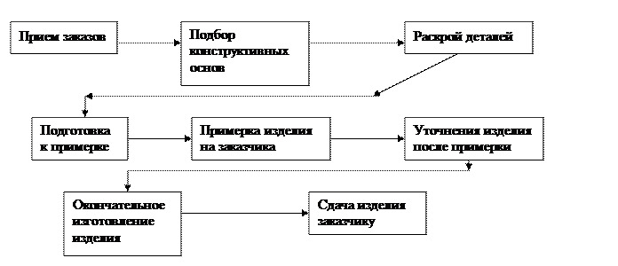 Особливості виробництва одягу по замовленнях населення є індивідуальність кожного замовлення як по конструкції, так і по наявності різних фасонів. Це визначає послідовність технологічного процесу, що в основному аналогічна процесу масового виробництва одягу. (підготовка нових модних зразків, розробка технічної документації, підготовка тканини до розкрою, розкрій і виготовлення одягу)