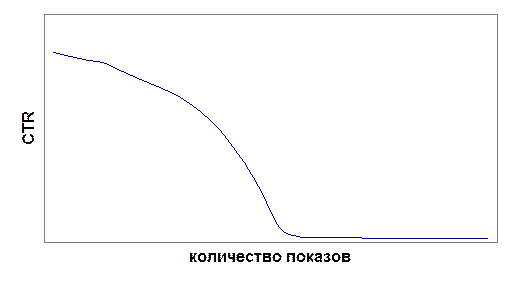 По мере показа баннера в определённой баннерной системе или на определённом веб-сайте увеличивается вероятность показа данного баннера одному и тому же пользователю несколько раз, что приводит к падению коэффициента проходимости. Это явление определяет причины неприятия рекламы потребителем, её отторжение. Зависимость его от числа рекламных показов выглядит так, как это отражено на рисунке 11. Таким образом, начиная с определённого момента, эффективность рекламы начинает снижаться.