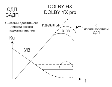 Т.к. оптимальный ток подмагничивания для разных частот разный, то в магнитофоне приходится выбирать какое-то среднее значение. СДП учитывает явление взаимоподмагничивания разных частот сигнала другими частотами и при большом уровне ВЧ-сигнала уменьшает ток подмагничивания, так что суммарный ток в Г3 остается постоянным.