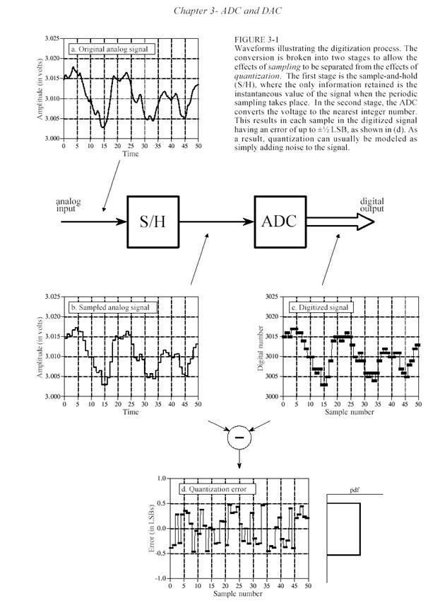 Мы намеренно не сравнивали рис. 2.1а срис.2.1с, поскольку здесь присутствуют оба эффекта. Раздельное рассмотрение целесообразно потому, что выборка и квантование вносят в сигнал различные искажения и управляются разными параметрами электроники. Кроме того, они не всегда используются вместе. Например, выборка без квантования используется в фильтрах на переключаемых конденсаторах.