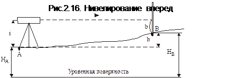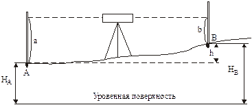 В нивелируемых точках А и В ставят рейки. Нивелир устанавливают между ними (не обязательно в створе), и по разности заднего а и переднего b отсчетов находят превышение h: