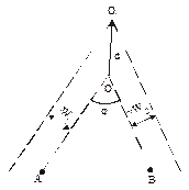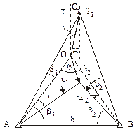 В этом методе (рис.3.11) с двух пунктов A и B, расстояние между которыми равно b, измеряют направление на вершину O 1 и основание O сооружения, причем для определения направления на ось сооружения производят отсчеты по правой и левой наружным граням, а за окончательное значение берут среднее арифметическое. Получив из наблюдений β1, β2, находят угол засечки