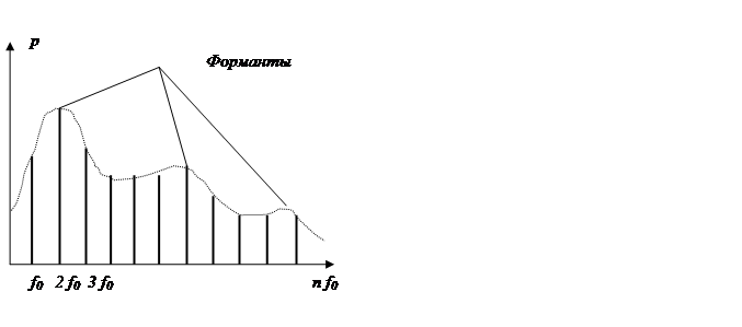 Далее импульсы воздуха проходят систему резонаторов, которые образуются объемами полости рта и носоглотки и изменяются в процессе произнесения различных звуков положением языка, зубов и губ. Проходя через эту систему резонаторов, одни гармонические составляющие импульсной последовательности основного тона получают усиление, другие - ослабление. Спектр гласного звука имеет линейчатый (дискретный) характер (рис.2.2.) где приняты следующие обозначения: р – уровни спектральных составляющих частоты основного тона; f0 – частотаосновного тона; 1,2,3… n – гармоники частоты основного тона.