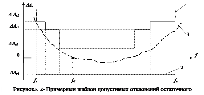 На рис.3.2 приняты следующие обозначения f0 – частота, на которой определяется номинальное значение ОЗ; fн , fв – нижняя и верхняя граничные частоты ЭППЧ; 1,2 – границы допустимых отклонений ОЗ; 3 – вид измеренной частотной характеристики ОЗ. Отклонения ОЗ от номинального определяются по формуле