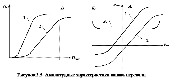 Из рассмотрения графиков, представленных на рис. 3.5 видно, что АХ имеет три участка: 1) нелинейный участок при малых значения напряжения или уровней сигнала на входе канала; нелинейность АХ при этом объясняется соизмеримостью напряжения или уровня сигнала с шумами самого канала; 2) линейный участок при значениях напряжения или уровня входного сигнала, для которого характерна прямая пропорциональная