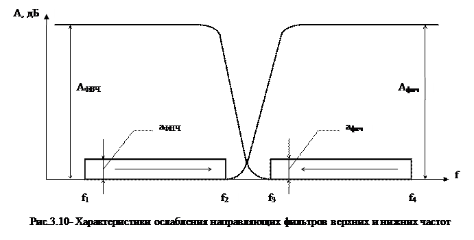 Из рассмотренного очевидно, что вилки направляющих ФНЧ и ФВЧ станций А и Б выполняют роль разделяющих устройств (РУА и РУБ, обведенные штриховыми линиями), развязывающих направления передачи. Частотные характеристики затухания (ослабления) ФНЧ и ФВЧ приведены на рис. 3.10, где приняты следующие обозначения: Афвч – затухание направляющего фильтра верхних частот (ФВЧ) в полосе эффективного задерживания f1-f2; аФВЧ – максимально-допустимое затухание ФВЧ в полосе эффективного пропускания; АФНЧ – затухание фильтра нижних частот (ФНЧ) в полосе эффективного задерживания f3-f4; аФНЧ – максимально-допустимое ослабление ФНЧ в полосе эффективного пропускания f1-f2.