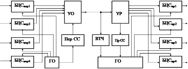 Сигналы с выходов БЦСпер совместно с сигналами цикловой синхронизации поступают на вход УО. Временной сдвиг между импульсными последовательностями на выходах БЦСпер обеспечивается управляющими импульсами с ГО. На приеме УР распределяет импульсы группового сигнала по своим БЦСпр, а также сигналы Пр. СС.