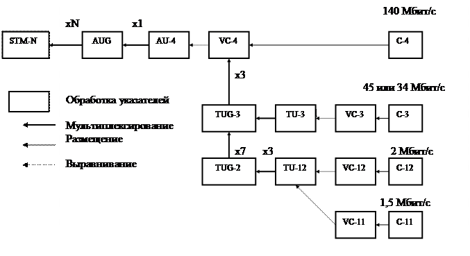 Ниже рассматривается технология размещения в модуле STM-1 63 потоков плезиохронной цифровой иерархии ИКМ-30 со скоростью 2,048 Мбит/с или 3 потоков плезиохронной цифровой иерархии ИКМ-480 со скоростью 34,368 Мбит/с.