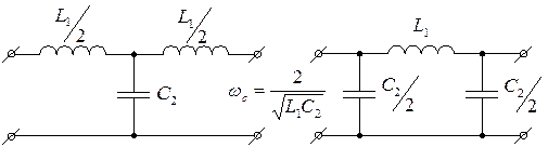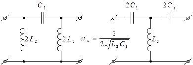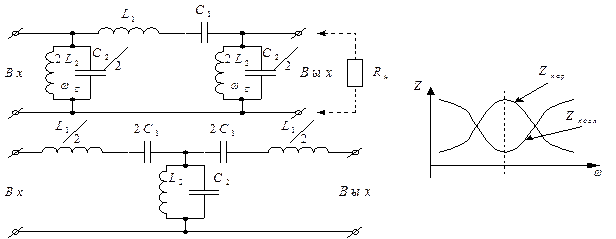 У такого фильтра, при изменении частоты в сторону от резонансной, сопротивление последовательного звена возрастает, а параллельного падает. На резонансной частоте, входное сопротивление фильтров активное и равно Rн. На частотах ниже резонансной последовательный контур имеет – емкостной характер, а параллельного – индуктивный, то есть полосовой, фильтр превращается в ФВЧ типа “К”.