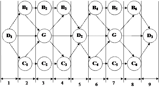 Где, G – подкомплексы операций разгрузки (G1) и загрузки (G2); D – подкомплексы вспомогательных операций, выполненных в процессе движения судна в пределах портовых вод (D1 – до окончания швартовки, D2 – во время перешвартовки, D3 - начиная с отшвартовки); В и С – подкомплексы, соответственно, вспомогательных операций и операций обслуживания судна, производимых: до начала выгрузки (В1 и С1), параллельно с выгрузкой (В2 и С2) и после окончания выгрузки (В3 и С3), до начала загрузки (В4 и С4), параллельно с загрузкой (В5 и С5) и после окончания загрузки (В6 и С6).
