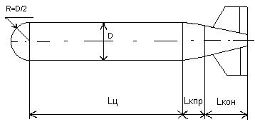Основной объем аппарата составляет цилиндрический корпус диаметра D и длины Lц. Носовая часть полусферическая с радиусом R=D/2. Кормовая часть имеет профилированный участок длины Lк.пр. с уравнением образующей