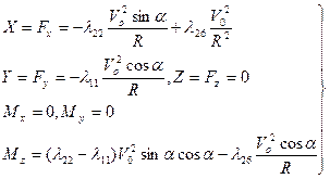 Как видим, центр масс тела описывает горизонтальную окружность радиуса R со скоростью Vo. Оси Ox и Oy тела горизонтальны и ось Ox составляет с направлением движения постоянный угол α. Ограничимся рассмотрением тела вращения. На основании (4.20)и (4.21)получим