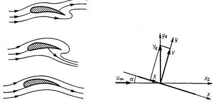 Такая ситуация на первый взгляд выглядит парадоксальной. В самом деле, предположим, что профиль представляет собой отрезок прямой линии (пластину). В невязком потоке существуют только силы давления, которые перпендикулярны поверхности пластины. Поэтому их равнодействующая будет также перпендикулярна к ней. Между тем, согласно теореме Жуковского, равнодействующая перпендикулярна скорости набегающего потока (рис. 5.4). Парадокс устраняется, если предположить, что на передней острой кромке возникает разрежение бесконечной величины, так что произведение бесконечного разрежения на бесконечно малую площадь остается конечным. Сила X, возникающая на передней кромке, является тянущей, обычно ее называют подсасывающей силой. Проекции сил X и Y на направление набегающего потока равны между собой, но противоположны по знакам, так что суммарное сопротивление оказывается равным нулю. В реальной жидкости бесконечные разрежения существовать не могут. В окрестности острой кромки поток отрывается, и подсасывающая сила не реализуется. Это приводит к появлению дополнительного сопротивления. Значит, в реальных конструкциях нужно стремиться к обеспечению плавного обтекания передней кромки. Для этой цели применяют профили с плавными обводами носовой части, а в случае необходимости и отклоняемые носики (предкрылки).