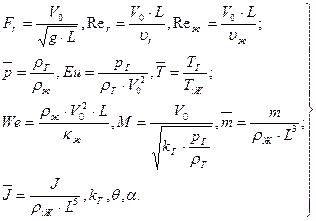 В отличие от рассмотренного ранее примера о подобии течений при проникании клина и конуса в жидкость рассмотрим теперь условие подобия полного процесса погружения тела с характерным линейный размером L, массой m и моментом инерции J. Пусть кинематические условия входа характеризуются скоростью приводнения V0, углом атаки α и углом приводнения θ. Физические параметры газовой среды сопроводим индексом «г», а жидкости — индексом «ж». Тогда в предположении несжимаемости жидкости будем иметь следующие размерные величины, характеризующие процесс: ρг — плотность, pг — давление, Тг —температура, υг —коэффициент кинематический вязкости, kг — показатель адиабаты, ρж — плотность, υж — коэффициент кинематической вязкости, χ — коэффициент поверхностного натчженич, Тж — температура, g — ускорение свободного падения. Общее число параметров, определяющих процесс погружения, равно 16. Согласно теории подобия можно сформировать 13 безразмерных комплексов. Выпишем их: