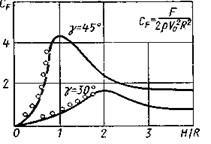 Если конус имеет конечную высоту и радиус его донного среза равен R, то сила сопротивления примет максимальное значение, когда свободная поверхность жидкости достигнет плоскости донного среза конуса. На рис. 8.7 приведены результаты численного расчета коэффициента сопротивления