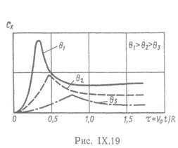 допустимо отдельно рассматривать вертикальное и горизонтальное движения. В рамках «ударной» теории удобно применять для обоих видов движения соответствующий удар трехосного эллипсоида, вертикальная полуось которого равна глубине погружения сферы, горизонтальная полуось—радиусу сферического сегмента в плоскости невозмущенной поверхности жидкости, а третья полуось находится из условия равенства объемов эллипсоида и погруженной части сферы. Для угла приводнения 45° коэффициенты горизонтальной Сх и вертикальной Су компонентов сил изображены на рис. 8.15. Как видим, вертикальная компонента интенсивно нарастает на начальной стадии погружения, а горизонтальная - на конечной.
