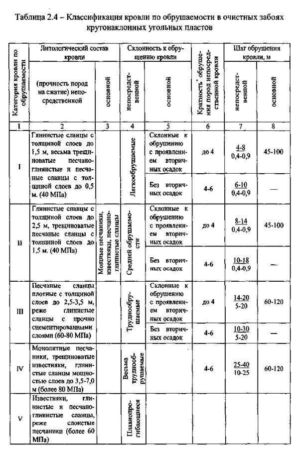 Отраслевые классификации вмещающих пологонаклонные угольные пласты пород по устойчивости и обрушаемости представлены в таблице 2.3 [9], крутонаклонных и крутых - в таблицах 2.4 и 2.5, включая классификацию их почвы по сползаемости (табл. 2.6) [10].
