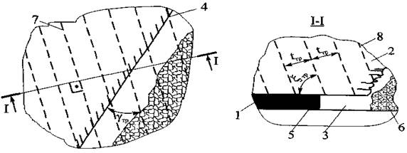 Устойчивость кровли в очистной выработке при всех прочих равных условиях зависит от положения прежде всего основной системы природной трещиноватости относительно линии очистного забоя и плоскости пласта, которое определяется соответствующими углами (рис. 2.2), где 1 – горизон-тально залегающий угольный пласт; 2 - кровля; 3 - очистная выработка; 4 - линия очистного забоя 5; 6 - выработанное пространство; 7 и 8 - следы пересечения плоскостей трещиноватости с плоскостями соответственно горизонтальной (в рассматриваемом случае их линии простирания) и нормаль-ной к напластованию (вертикальной); ξтρ и γтр - углы соответственно падения плоскостей трещиноватости и между их линиями простирания забоя; tтр - кратчайшее расстояние между плоскостями трещин.