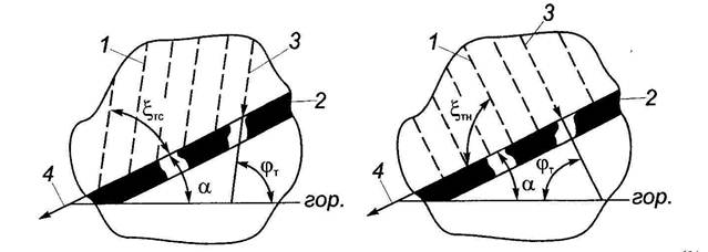 При совпадении направлений падения плоскостей (согласное) пласта и, скажем, трещиноватости, когда Ат = ATρ (рис. 4.3, а) угол между ними