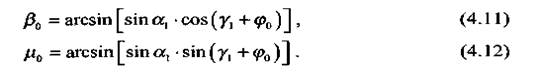 В рассматриваемом случае при развороте линии очистного забоя на угол φ0 относительно линии пересечения плоскостей Τ и Ρ (ON) соответствующие углы (см. рис. 4.4, б)