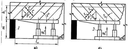 Рucyнoк 4.6 — Варианты направлений выемки пласта при совпадении (а) и несовпадении (б) линий очистного забоя и пересечения плоскостей основной природной трещиноватости кровли и пласта: 1 -угольный забой; 2 - секция механизированной крепи с рабочим сопротивлением RK; lпз - ширина призабойного пространства; hc — высота слоя; t0 — среднее расстояние между плоскостями трещиноватости; FT - составляющая сила в направлении смещения трещинно-образующш породных отдельностей
