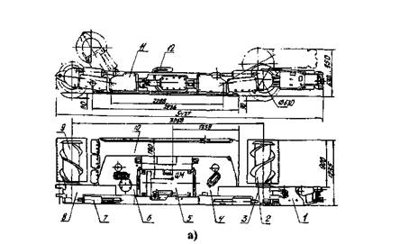 Рисунок 6.7- Комбайн "Темп-1": а — схема; б — общий вид: 1 — взрывобезро-пасный вывод; 2 - электродвигатель; 3 - щиток; 4 - гидроблок; 5 —режущая часть; 6 - прицепное устройство; 7 -оградитель канатов; 8 — втулка; 9-лыжа опорная; 10- защита кабеля; 11 - надставка нижняя; 12 - надставка верхняя 0 470 мм; 13 - надставка верхняя 0 560 мм; 14 и 15 - беспланочные регулирующие цепи для барабанов; 16-лыжа; 17—постель хвостовая; 18 - орошение на комбайне; 19 - кожух защитный