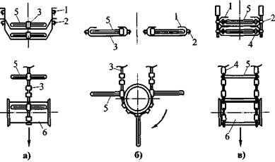 Профили рештачных секций разборных переносных конвейеров и схемы размещения в них скребковых цепей представлена на рис. 7.5, где 1 профиль соответствующего взаимозаменяемого (унифицированного) рештака с замковым соединением 2; 3 и 4 - скребковые цепи соответственно литая фигурная и круглозвенная; 5 - скребок; 6 - отклоняющие скребковую цепь соответственно на барабане и звездочке концевой головки конвейера.