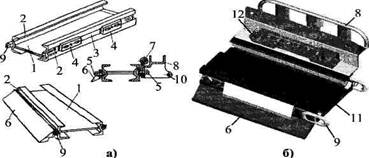 Тяговые органы передвижных неразборных конвейеров отличаются калибром и количеством круглозвенных скребковых цепей, их размещением в рештачном ставе. Рештачные секции этих конвейеров могут выполнены с люками в среднем днище, соединяющим боковины, для доступа к холостой ветви цепи с целью устранения ее порывов или самопроизвольных рассоединений, а также закрытого типа с нижним днищем со стороны почвы пласта, изолирующим попадание горной массы в холостую ветвь цепи и ее зашты-бовку. Конструктивной особенностью передвижных конвейеров может также быть наличие и размещение на их рештачном ставе навесного оборудования (рис. 7.6), где 1 - рештак со средним днищем без окна; 2 - боковины с продольными впадинами 3 и жестко укрепленными планками 4 с проушинами для крепления навесного оборудования; 5 - крепежные болты; 6 - зачистной лемех; 7 - направляющая для комбайна; 8 - борт кабелеукладчика; 9 - элемент замкового соединения рештаков; 10 - кронштейн для подсоединения домкрата передвижки; 11- нижнее днище; 12 - рейка для зацепления звездочки блока подачи комбайна.