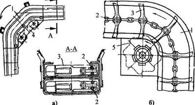 По направлению перемещения грузопотока передвижные скребковые конвейеры подразделяются на прямого и углового действий. Существуют различные по конструкции устройства на скребковом конвейере, изменяющие направление движения его цепей. Два из них представлены на рисунке 7.8.