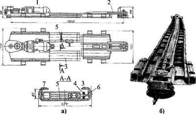 Рисунок 7.9 - Скребковый конвейер типа 1СК-38М: а - схема; б — общий вид: 1 и 2-головки соответственно приводная и концевая; 3 —рештачный став; 4 - круглозвенная цепь со скребками 5; 6 - проушина (скоба); 7 ~ штырь соединительный