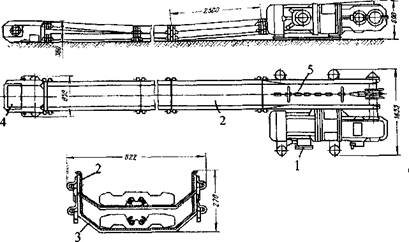 Рисунок 7.11 -Переносной скребковый конвейер типа С-50:1 - приводная головка; 2 иЗ- линейные взаимозаменяемые секции рештачного става соответственно верхнего и нижнего; 4 - концевая головка; 5 - круглозвенная разборная скребковая цепь