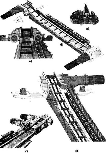 Рисунок 7.16-Общие виды очистных скребковых конвейеров типов; СПЦ-271 (а); СПЦ-326-40.26 (б); СЛЦ-250 (в); СП-202В1М(г); КСД-26В (д)