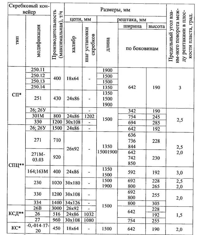 | Относительная масса цепи со скребками, кг/м | 11,5 | 19,1 | 20,8 | 20,8 | 17,7 | 21,0 |