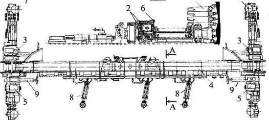 Рисунок 8.13- Струговая установка типа СО-75М: 1 - струг с тяговой цепью 2 и приводами 3; 4 - скребковый конвейер с приводами 5; б-система орошения; 7 - гидростолы с направляющими балками и распорными стойками; 8и9- домкраты прижатия и продольного действия
